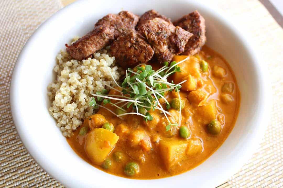 Add the chickpeas, tomatoes, and vegetable stock. Let it simmer for 20 minutes. While the curry is simmering, purée the cashews with the almond milk in a blender. Add the cashew mixture and frozen peas to the curry and simmer for another 5 to 10 minutes.