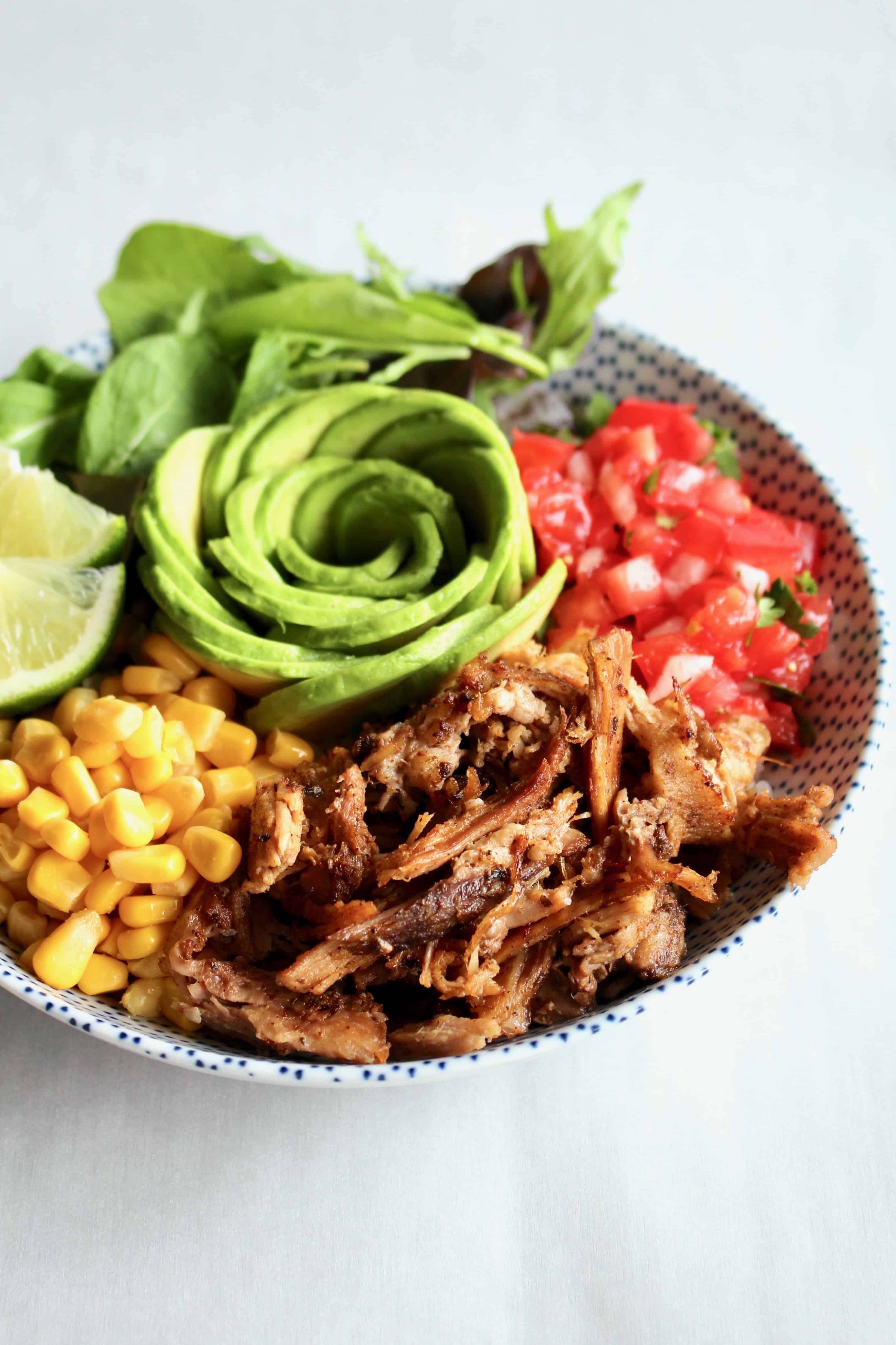 I had my slow cooker carnitas on a rice bowl with baby greens, avocado, simple pico de gallo (sans jalapeños because I forgot to get some), and corn. I also added extra cilantro and a squeeze of a lime wedge and it was the bomb!
