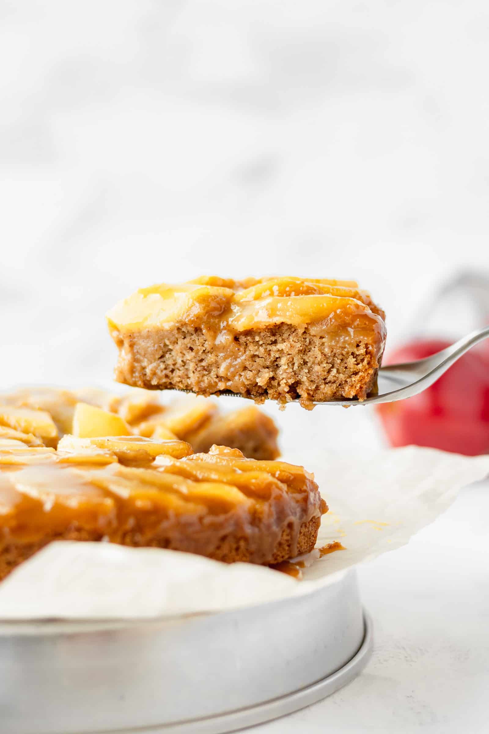 This caramel apple upside-down cake is spiced, fluffy and moist, topped with luscious vegan salted caramel and delicious sliced apples!