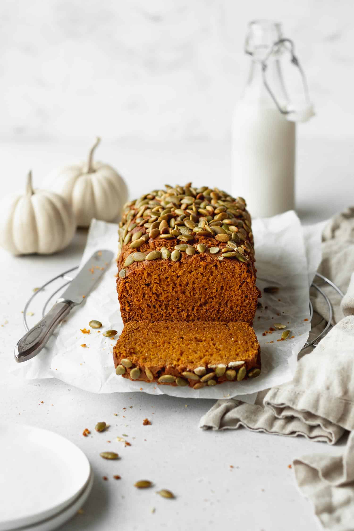 This gluten free pumpkin bread is THE BEST! It's super moist from the maple syrup, with the perfect amount of sweetness and spices.