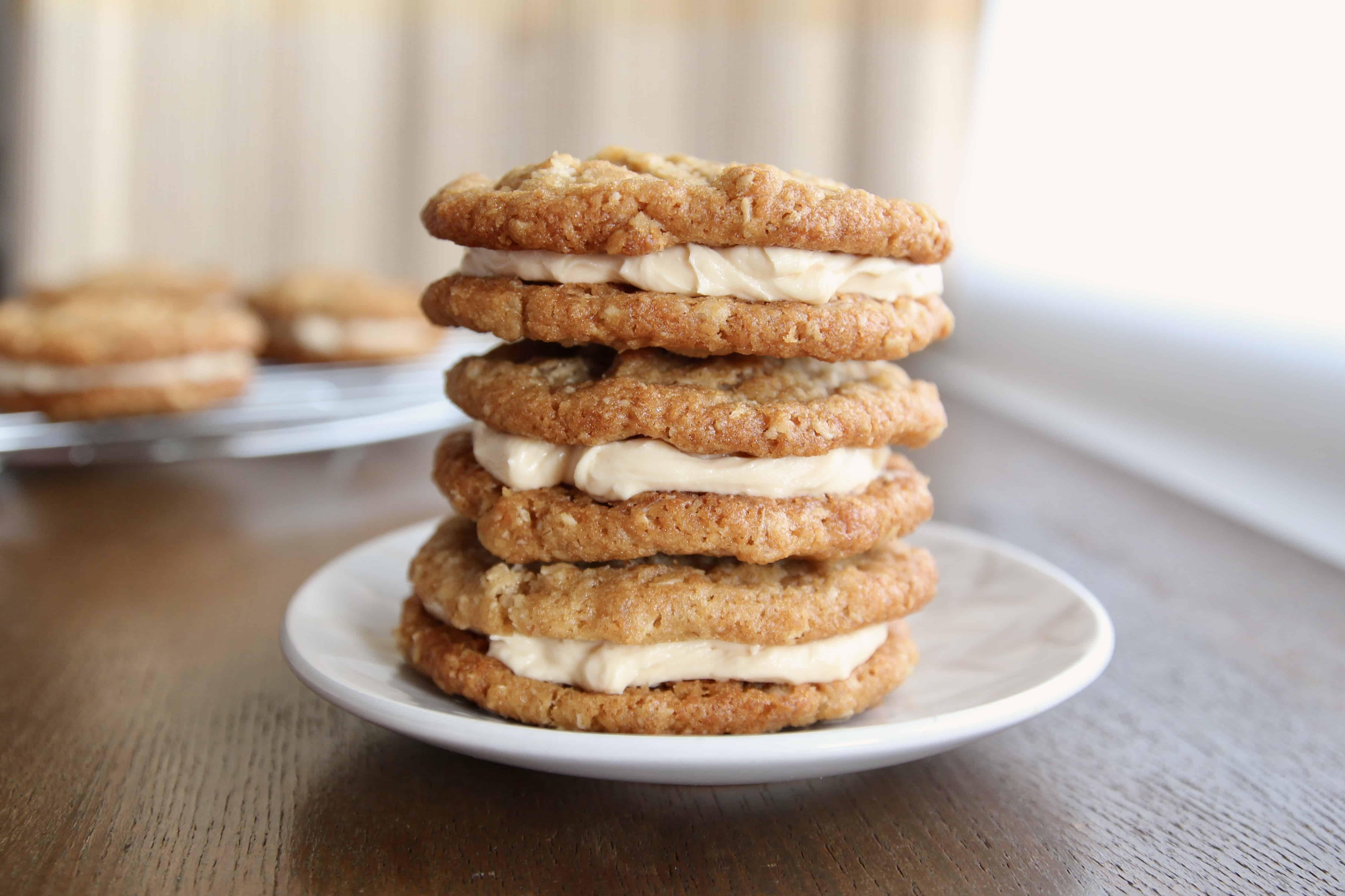 Fluffy salted caramel buttercream sandwiched between chewy coconut oatmeal cookies. They are dangerously good.