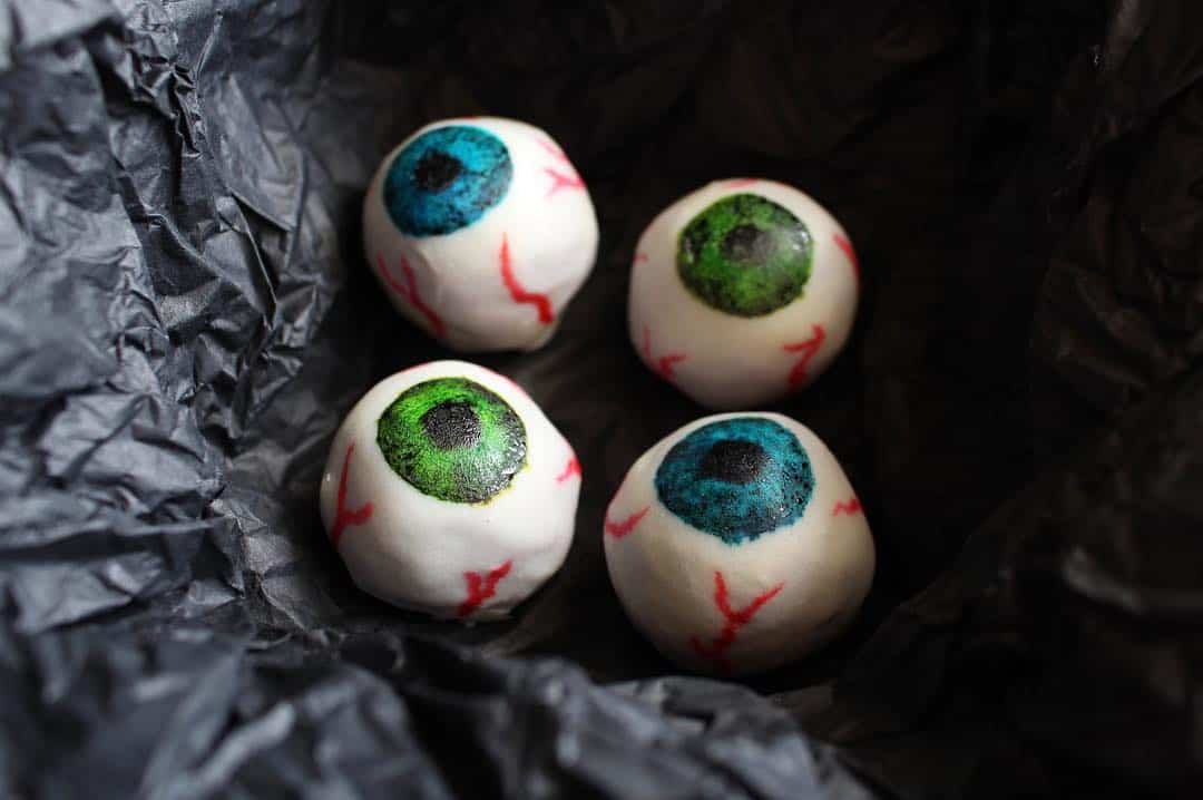 These Halloween white chocolate eyeballs have a surprise filling: purple sweet potato! A much healthier option for trick or treating kids on Halloween!