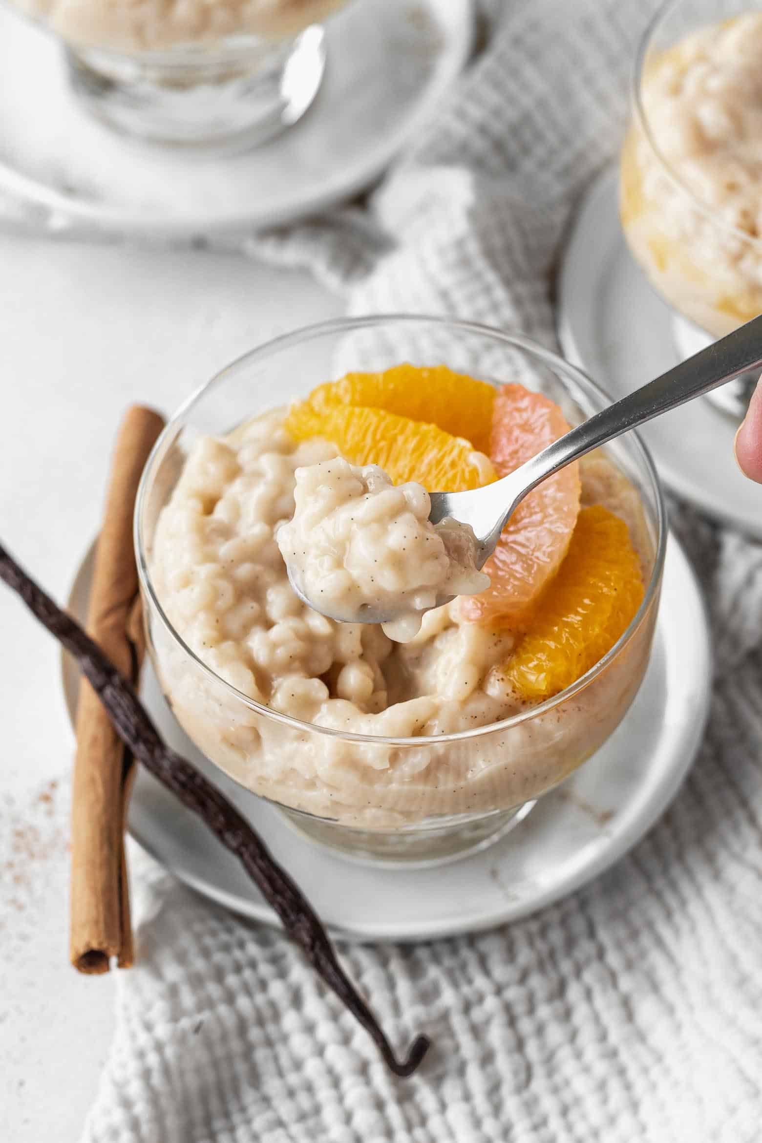 This vegan rice pudding is creamy, not too sweet, and delicious hot or cold! Serve it with spiced orange compote for a fruity twist!