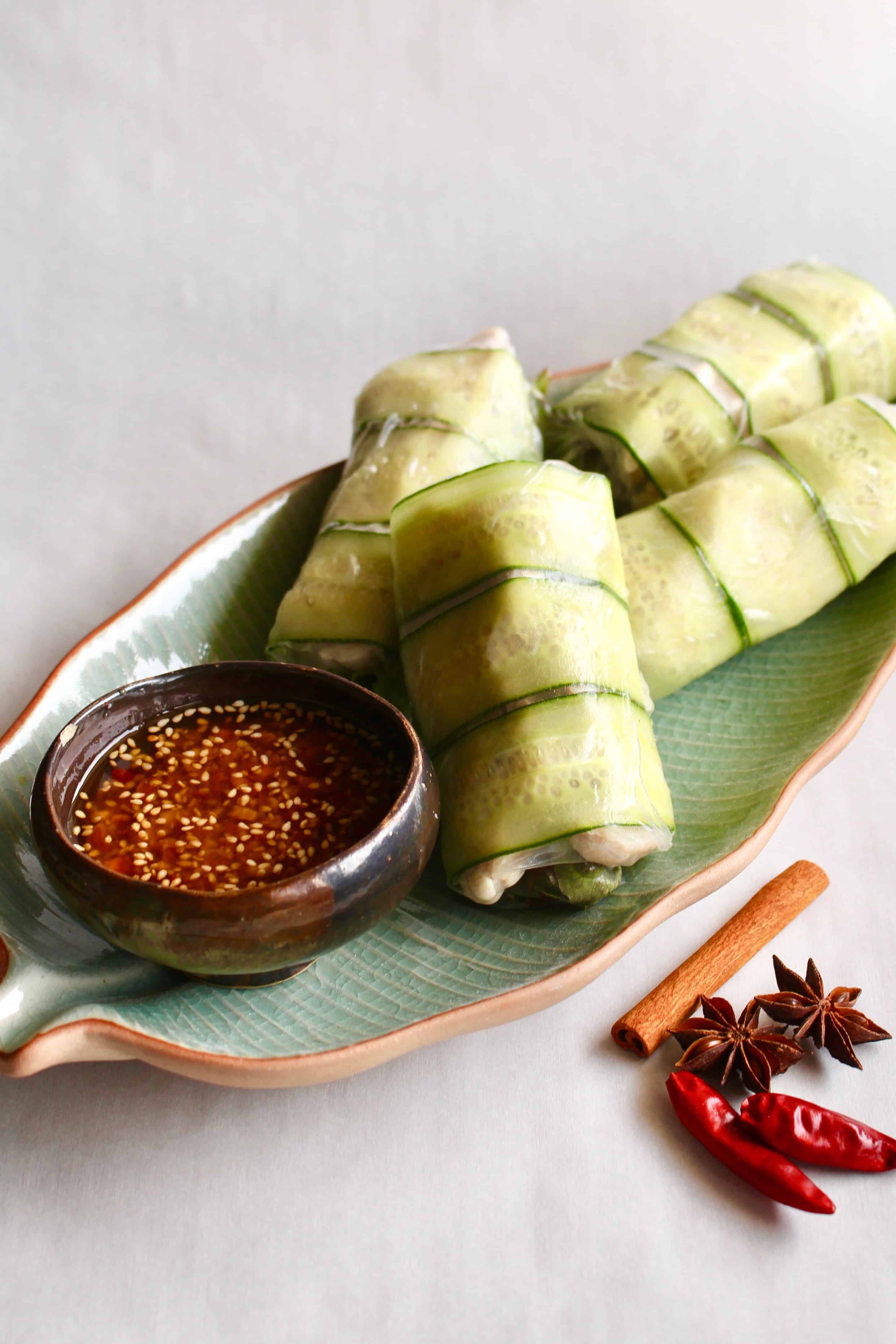 Juicy chicken and fresh vegetables wrapped in rice paper with a Szechuan style spicy dipping sauce!